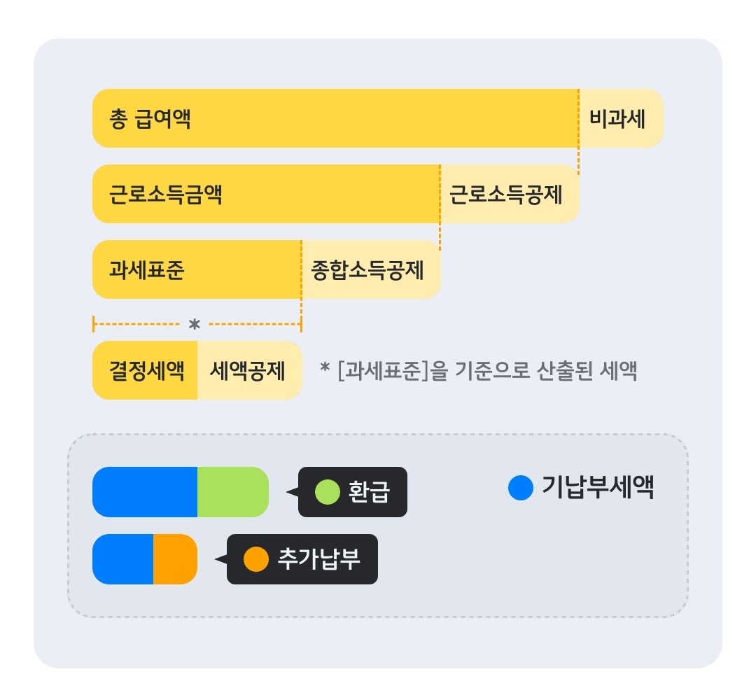 연말정산은 원천징수한 소득세와 실제 그 해에 내야할 세액을 비교하여 정산하는 것을 말합니다. 과세기간 동안 덜 납부한 금액은 국가에 추가로 징수되지만, 반대로 더 납부한 금액이 있다면 돌려받을 수 있습니다