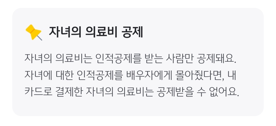 - 하지만 의료비 공제는 소득이 낮은 배우자에게 몰아주는 것이 좋습니다. 의료비는 총 급여액의 3%를 초과하는 금액을 공제 해주기 때문입니다. 배우자가 대신 내준 의료비도 공제가 가능해서, 의료비는 소득이 낮은 한 명의 카드로 결제하는 것이 유리합니다.